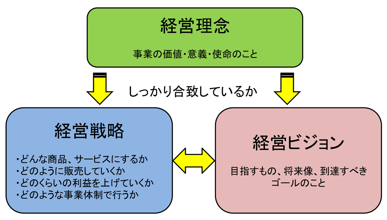 こうした『経営理念』と『経営ビジョン』が、『事業戦略』と整合性が取れたものにすることが大切です。